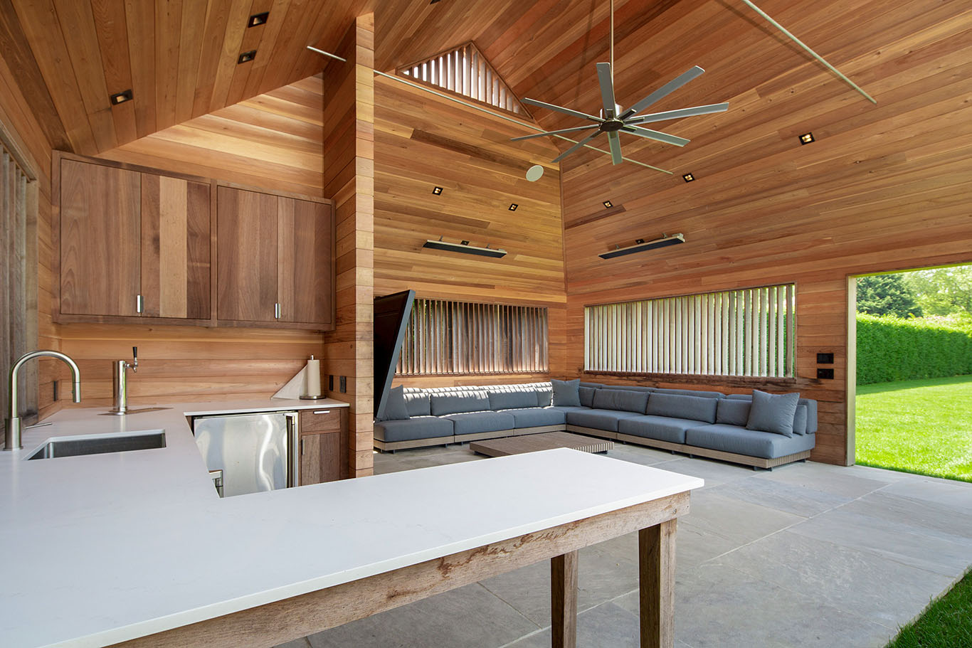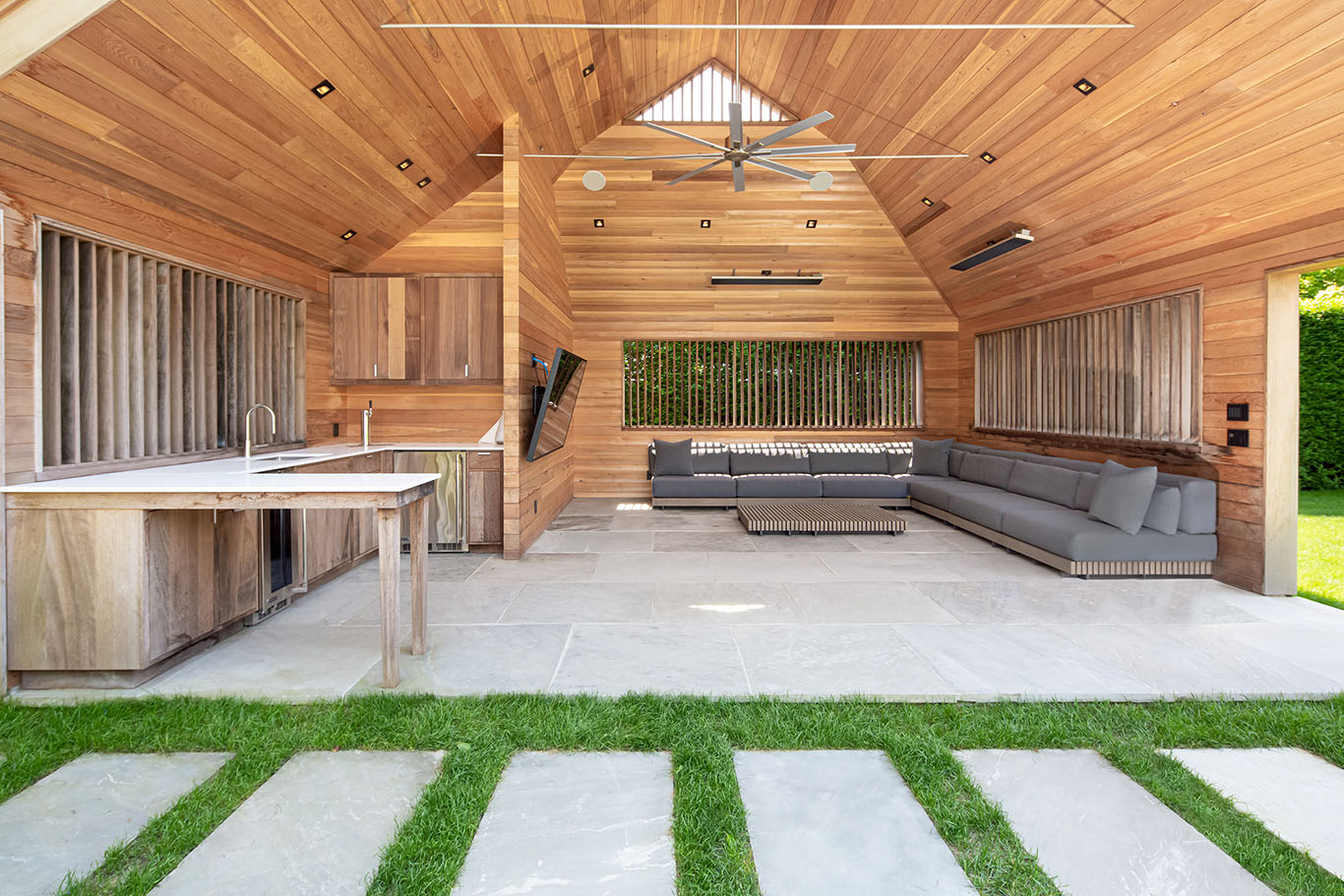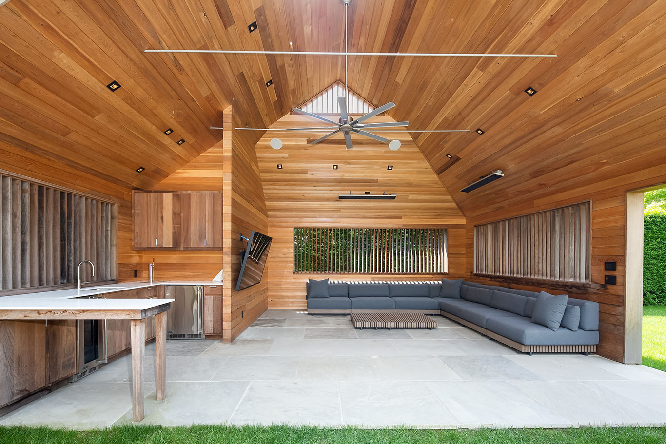 This pool pavilion was conceived as a seamless outdoor living space. Equal parts lounge, kitchen, and entertainment space. Designed with modern barn-inspired silhouette, the structure features a cedar-clad ceiling with integrated lighting, ceiling fans, and radiant heaters, ensuring comfort in all seasons.