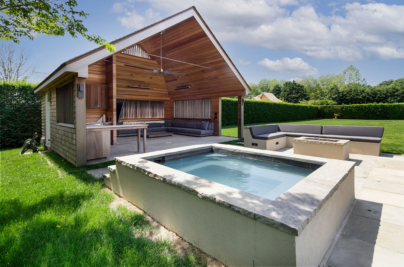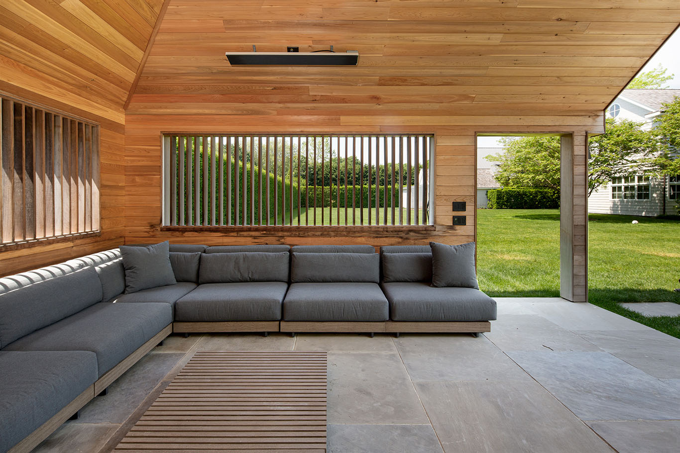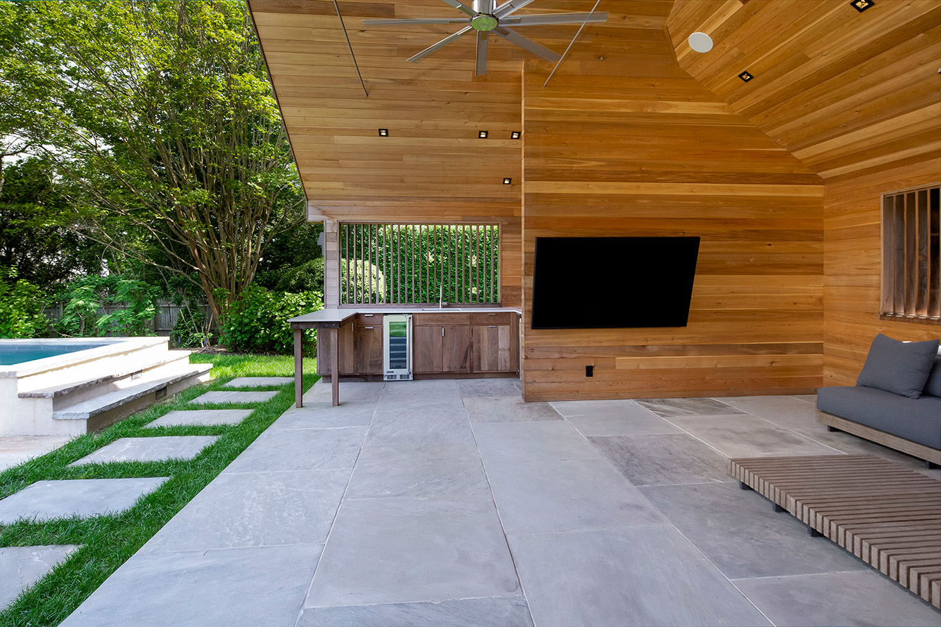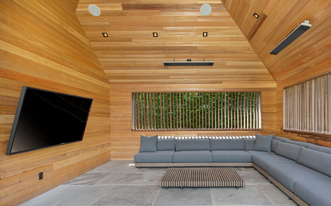 This pool pavilion was conceived as a seamless outdoor living space. Equal parts lounge, kitchen, and entertainment space. Designed with modern barn-inspired silhouette, the structure features a cedar-clad ceiling with integrated lighting, ceiling fans, and radiant heaters, ensuring comfort in all seasons.