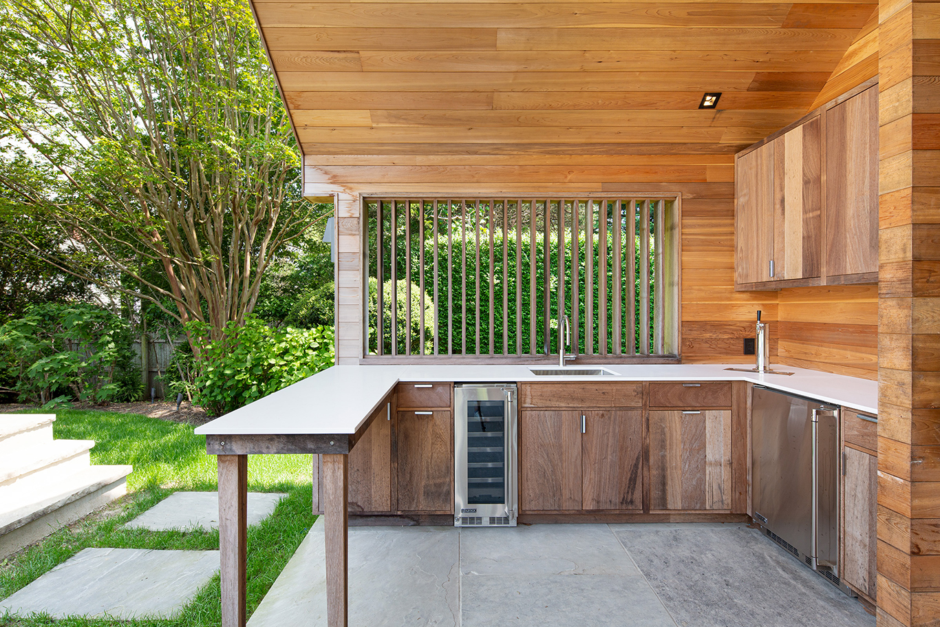 The open-air plan is fully equipped with outdoor kitchen, featuring stone countertops, custom wood cabinetry, and integrated appliances. The spatial layout separates cooking and lounging zones while maintaining unobstructed sight-lines across the pool and garden. Slatted wood screens provide both privacy and filtered natural light, balancing the enclosure with a connection to the landscape.