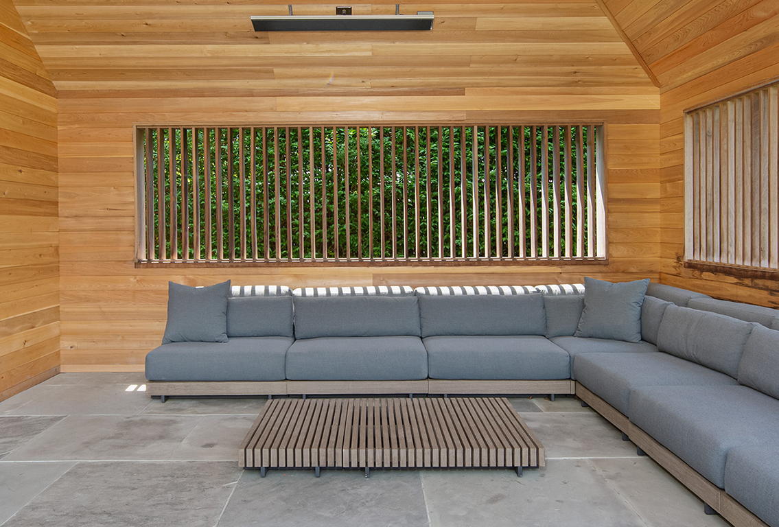 The lounge area features large-format stone pavers extending from interior to exterior, visually linking the pavilion to the pool terrace and adjacent spa. This continuity of material enhances the indoor-outdoor flow, while the pavilion’s crisp geometry and warm natural finishes create a retreat that is at once functional, elegant, and deeply tied to its setting.